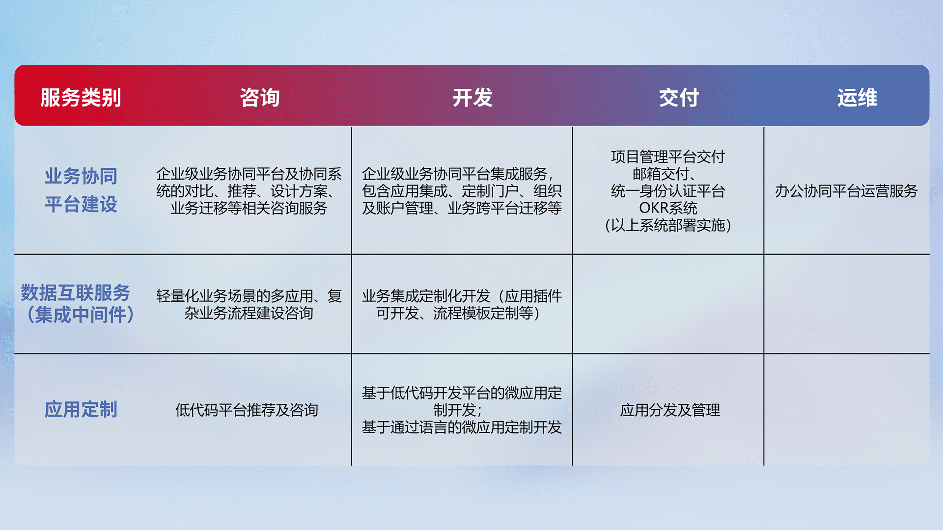 针对钉钉、、企微、、、、IDaas等平台级产品提供产品的规划、、、、方案、、交付、、定制化开发等服务,,实现如统一协同办公、、智能客户服务、、、、混合会议管理、、、智能数据查询、、等业务场景,,,实现数字化转型。。。。
